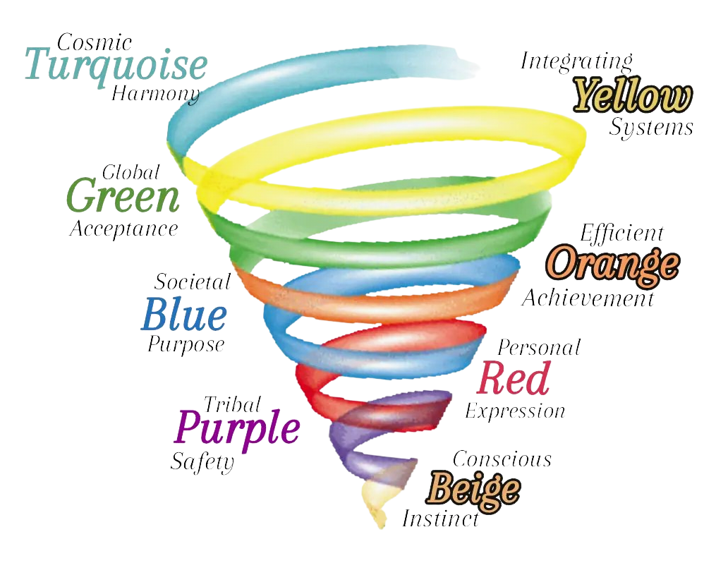 The theory states that individuals and collectives “move through” the colors of the Spiral in order, from 🤎Beige (SurvivalSense) → 💜Purple (KinSpirits) → ❤️Red (PowerGods) → 💙Blue (TruthForce) → 🧡Orange (StriveDrive) → 💚Green (HumanBond) → 💛Yellow (FlexFlow) → 🩵Turquoise (WholeView).