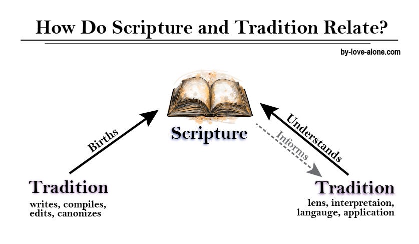 Thus, it’s not possible to even understand the Bible, except through the lens of tradition. The diagram below helps to show my thinking on the subject: